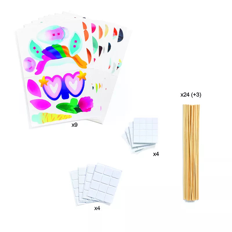 The costume combinations are endless thanks to the many interchangeable accessories: no 2 photos are the same. The instructions provide step-by-step creative tips. An ideal activity to organize an animation with children! Contents: 9 illustrated boards with detachable pieces (8 animals + 32 accessories), 27 bamboo sticks, 4 sets of double-sided foam stickers, 1 set of instructions. Perfect from 4·8 years.