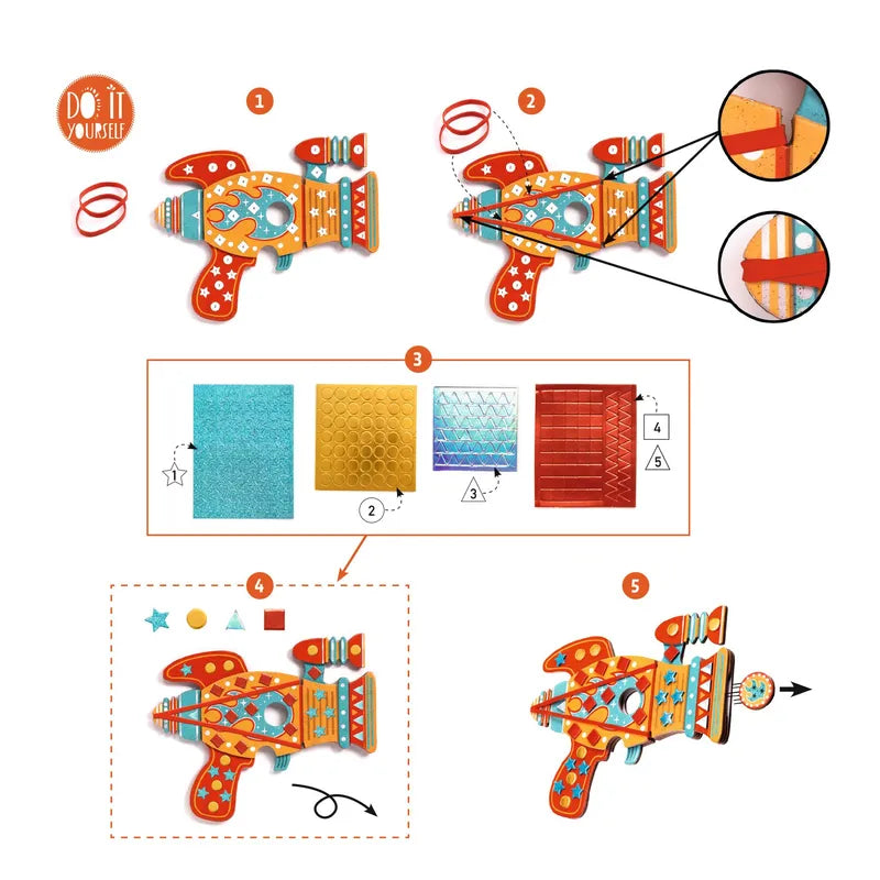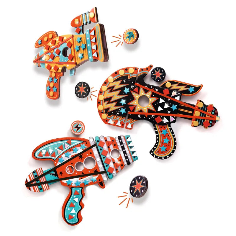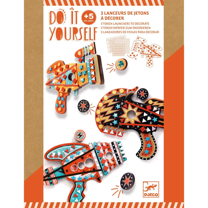 A creative kit containing three counter launchers to decorate with mosaic stickers. Children place the stickers according to the numbers on the launchers. Once all three are finished, all you have to do is arm yourself with counters and head off to conquer the galaxy! 5 years.