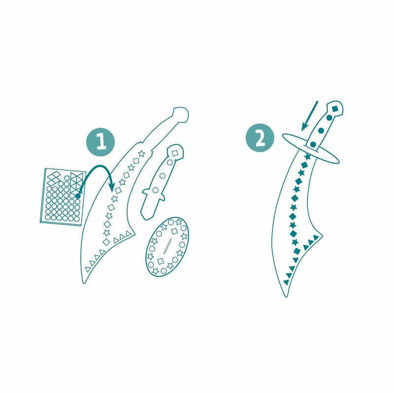 A creative kit for decorating pirate swords with mosaic stickers. Children place the metallic stickers according to the numbers on the swords.
