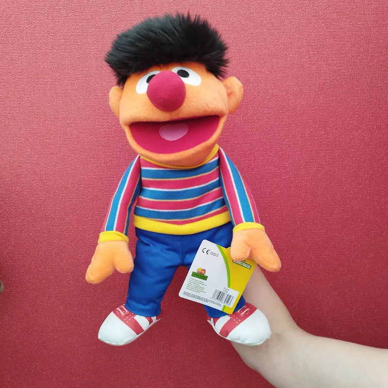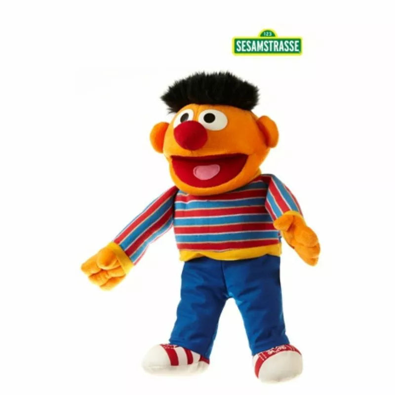 Ask Ernie from Sesame Street to tell a story! A mouth hand moving puppet easy to use for both children and adults. 33-37cm. The puppeteer (whether child or adult) inserts one hand through the opening in the back of the puppet. By using the movable mouth it is easy to create loads of funny facial expressions and mimics.