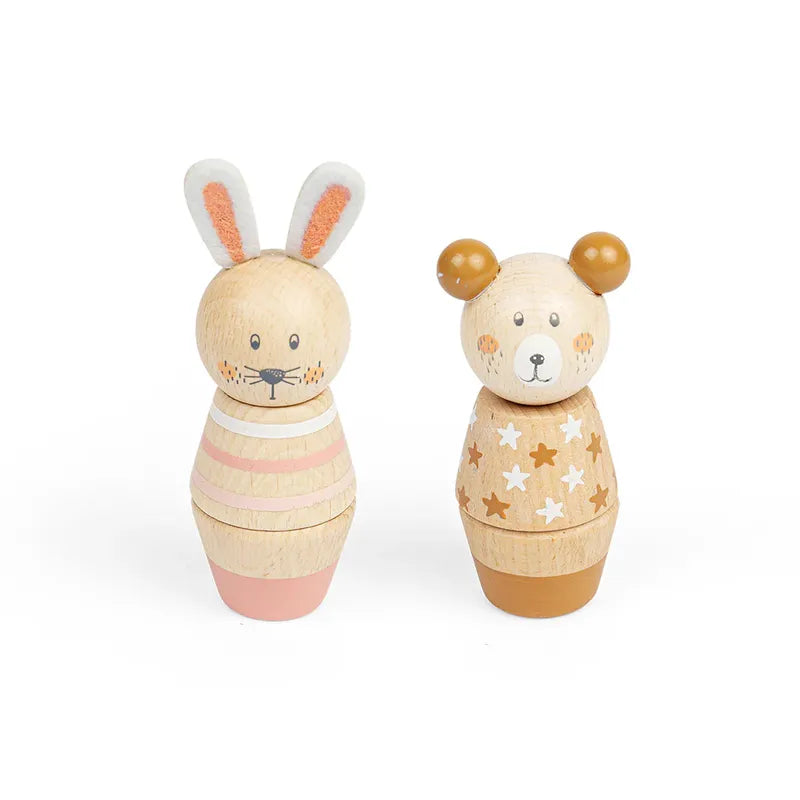 An engaging and fun activity to encourage fine-motor skills. The characters can be used as play figures. The Bunny are Bear are crafted from FSC® Certified wood and finished with non-toxic paints and lacquers. 8.5cm tall. They are safe for 18+ months and conform to European safety standards.